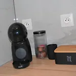 Het appartement heeft bovendien een keuken met een magnetron, een koelkast en keukengerei.